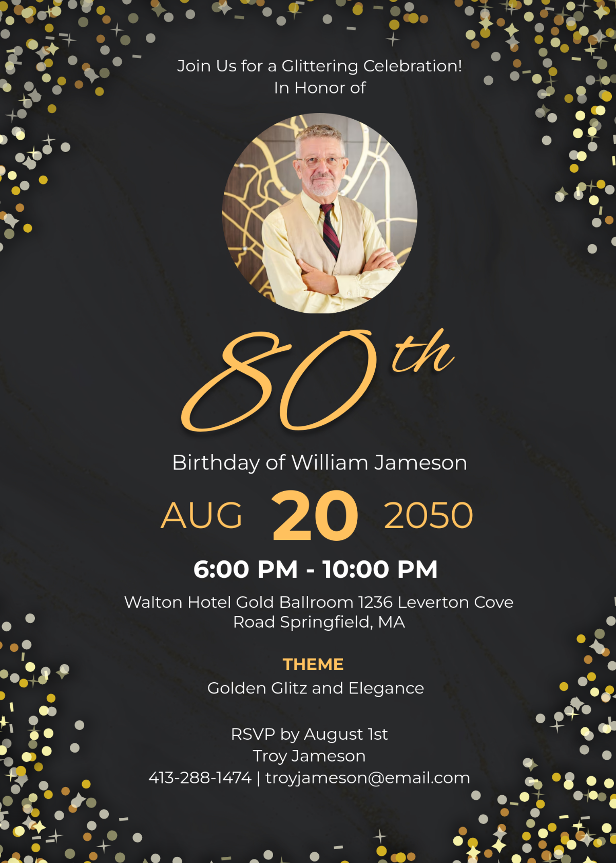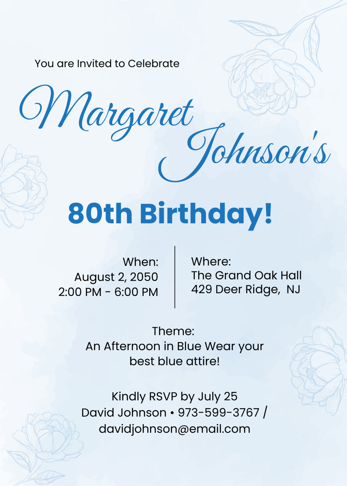 As the big day approaches, make sure to follow up with reminders and updates to keep your guests informed and excited about the upcoming celebration. With a well-designed 80th birthday invitation template, you’re sure to make a lasting impression and create a special memory for the honoree and all who attend the party.