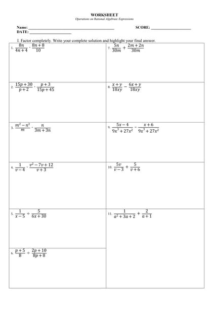 Rational expressions are algebraic expressions that involve fractions with variables in the numerator and/or denominator. Adding and subtracting rational expressions can be challenging for students, as it requires a good understanding of factoring and simplifying fractions. To practice and improve these skills, a worksheet focusing on adding and subtracting rational expressions can be very helpful.
