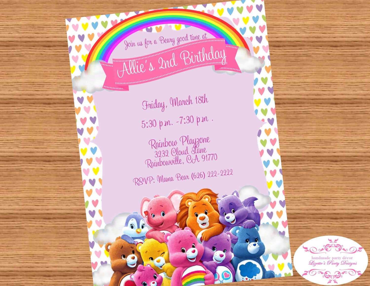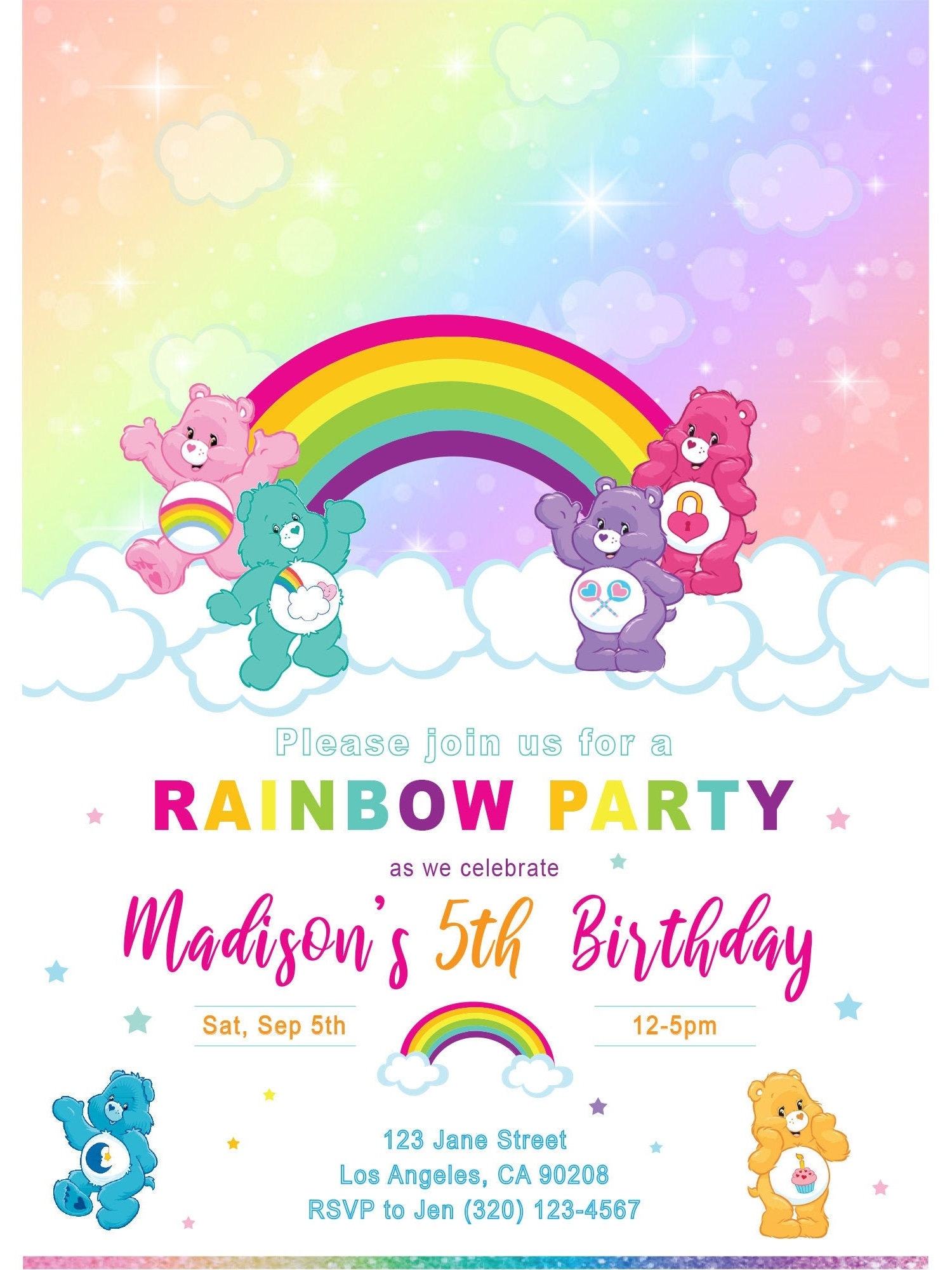Our Care Bear invitation templates feature all your favorite Care Bear characters like Cheer Bear, Funshine Bear, and Grumpy Bear. The colorful designs and cute illustrations will set the perfect tone for your party. You can easily customize the templates with your event details and personalize them to match your party theme. Simply download, print, and send them out to your guests!