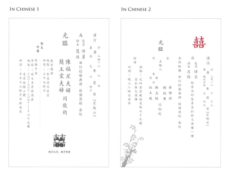 Chinese wedding invitations are known for their elegance and traditional designs. They often feature symbolic elements such as dragons, phoenixes, and double happiness symbols. These invitations are a reflection of the rich cultural heritage of China and are a perfect way to set the tone for a traditional Chinese wedding.