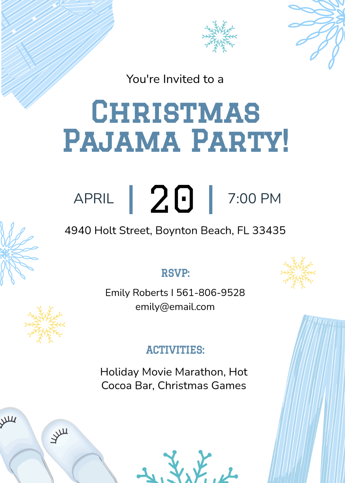 Make your Christmas pajama party extra special by sending out invitations that reflect the warmth and joy of the holiday season. Our free invitation template is the perfect way to set the tone for a night of festive fun and celebration with your nearest and dearest.