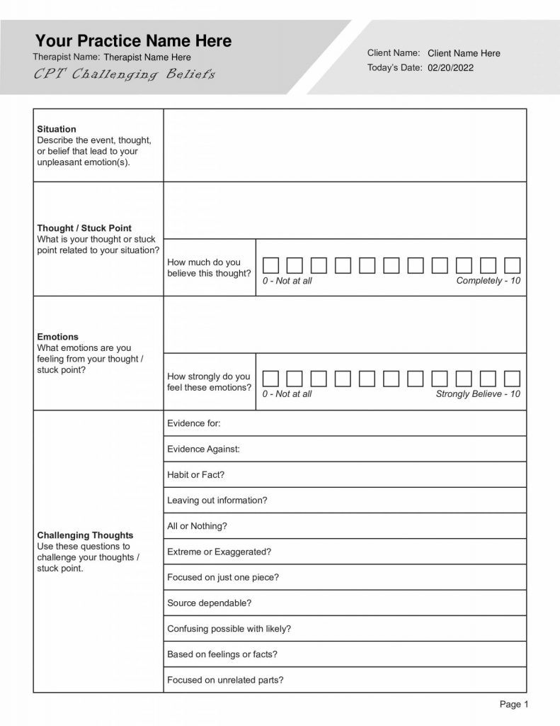 One common worksheet used in CPT is the “Challenging Beliefs Worksheet,” which prompts individuals to identify and challenge negative beliefs they may hold about themselves, others, and the world. By working through this worksheet, individuals can begin to see how their negative beliefs may be impacting their thoughts and behaviors, and ultimately work towards changing them.