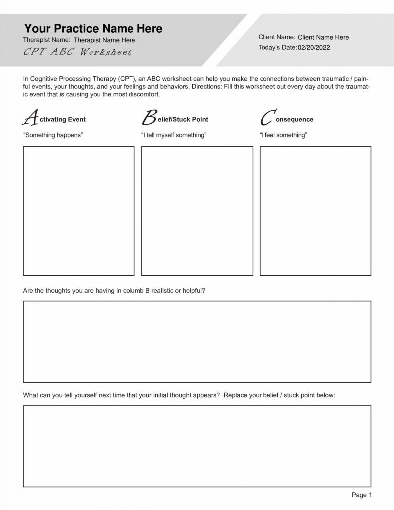 Cognitive Processing Therapy (CPT) is a type of cognitive behavioral therapy that is commonly used to help individuals who have experienced trauma. It focuses on changing unhelpful beliefs and thoughts related to the traumatic event, ultimately helping individuals process and move past their trauma. One of the key tools used in CPT is worksheets, which are designed to guide individuals through the process of challenging and changing their thoughts.