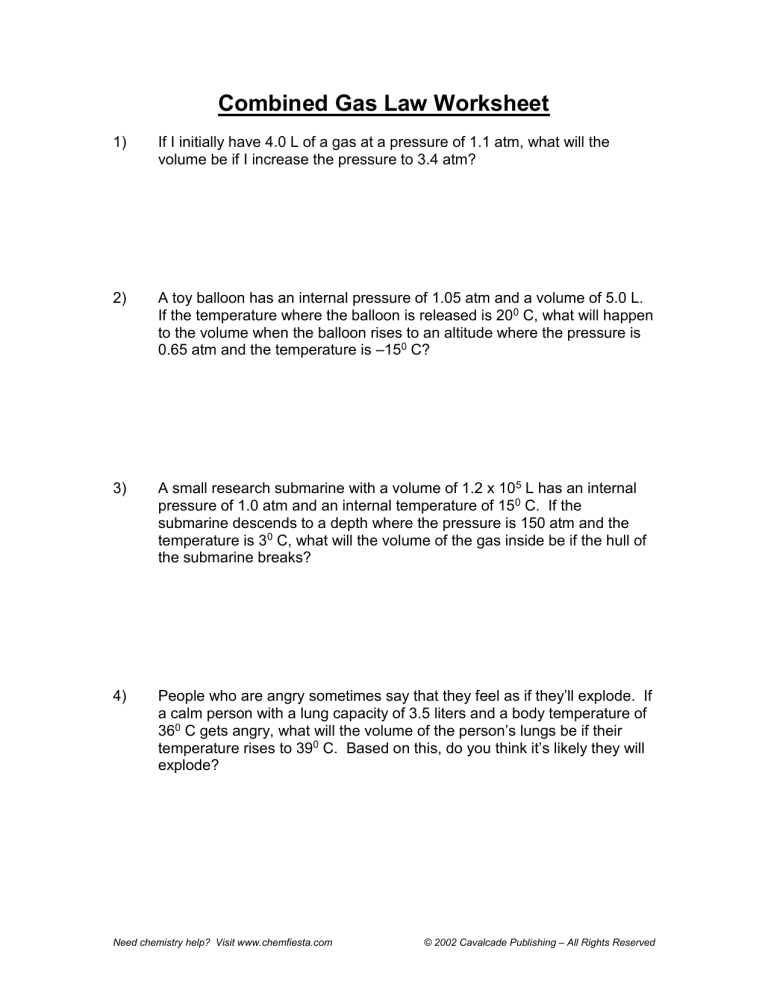 Working through these types of problems on a worksheet can help students build confidence in their understanding of the combined gas law and how it applies to real-world situations. By practicing with different scenarios, students can improve their problem-solving skills and apply the concepts they have learned in class.