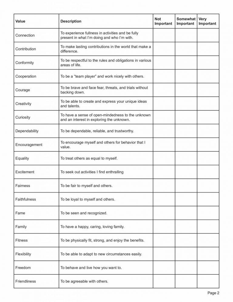 The core values worksheet typically consists of a list of values such as integrity, honesty, compassion, creativity, and so on. Individuals are asked to review the list and select the values that resonate with them the most. They are then encouraged to prioritize these values based on their importance and relevance to their lives.