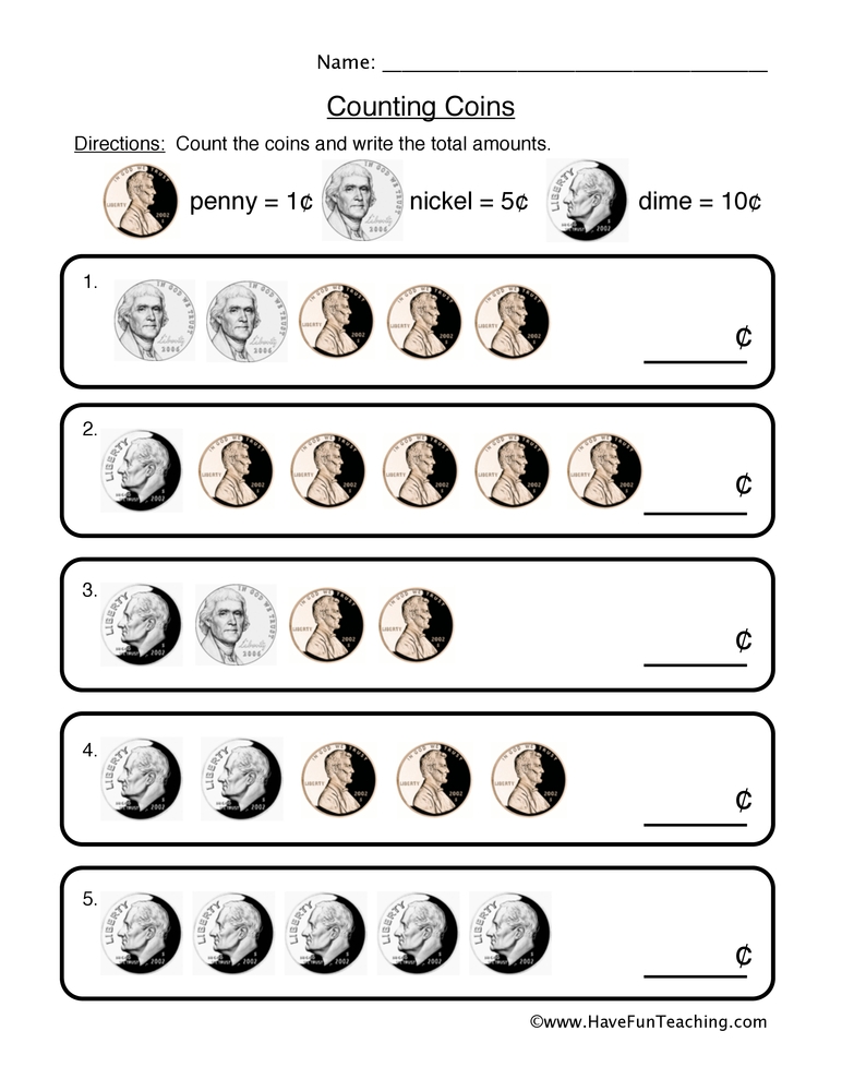 1. Identification: These worksheets focus on helping children identify different coins, such as pennies, nickels, dimes, and quarters. By recognizing the coins and their values, children can then practice counting them accurately.