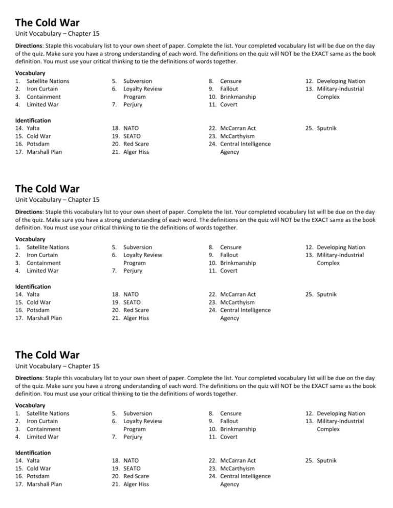 Course Hero offers a vocabulary worksheet that focuses on key terms related to the Cold War. This worksheet helps students understand the complex relationships, ideologies, and conflicts that defined this era. By mastering these vocabulary terms, students can gain a deeper insight into the political, economic, and social dynamics of the Cold War.