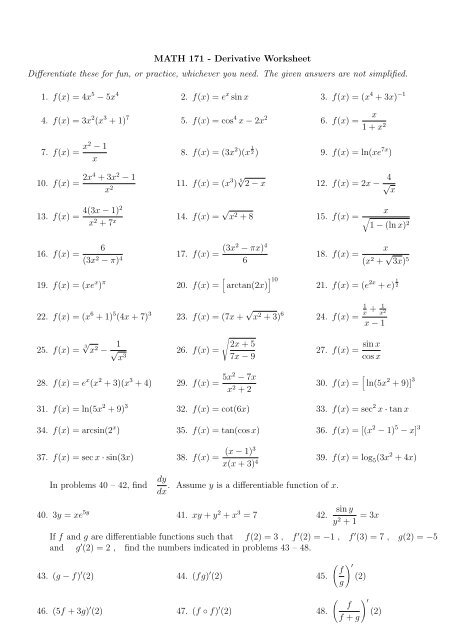 Derivative worksheets typically consist of a series of problems that require you to find the derivative of a given function. These problems may range from simple to complex, allowing you to gradually build your proficiency in calculating derivatives. By working through these worksheets, you can sharpen your skills and gain confidence in your ability to solve derivative problems.