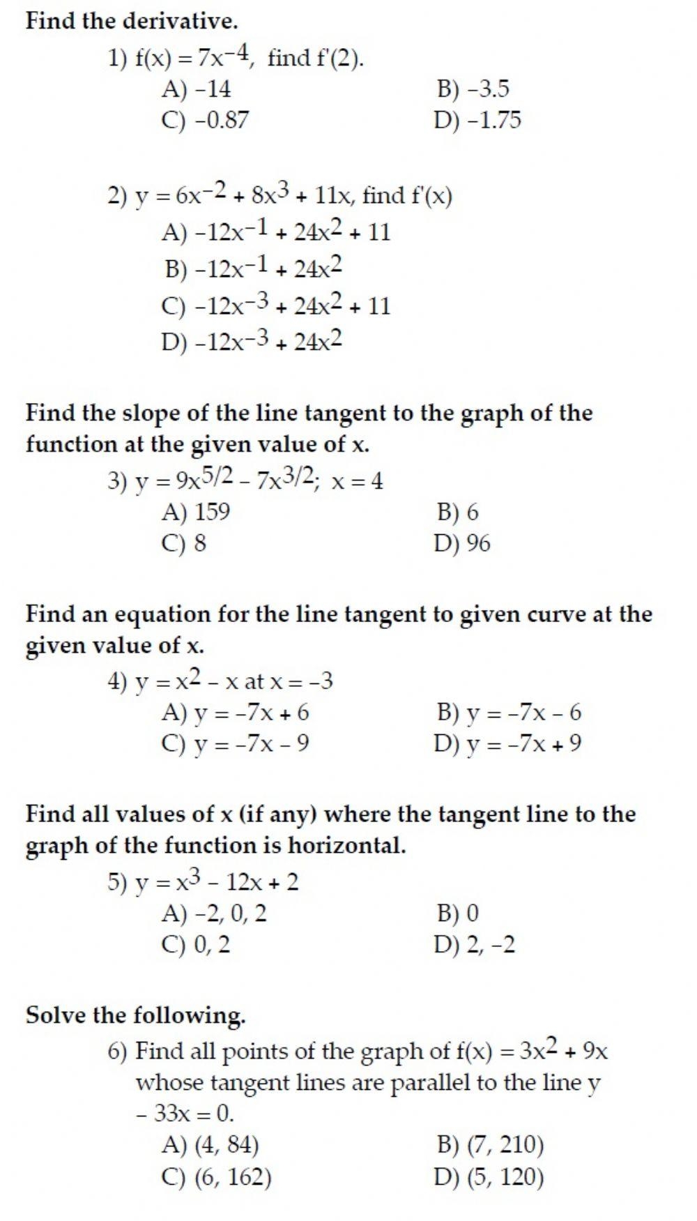 Derivatives play a crucial role in calculus and are essential for understanding the rate at which quantities change. One effective way to practice and improve your skills in calculating derivatives is by using derivative worksheets. These worksheets provide a variety of problems that test your knowledge and understanding of the derivative rules and concepts.