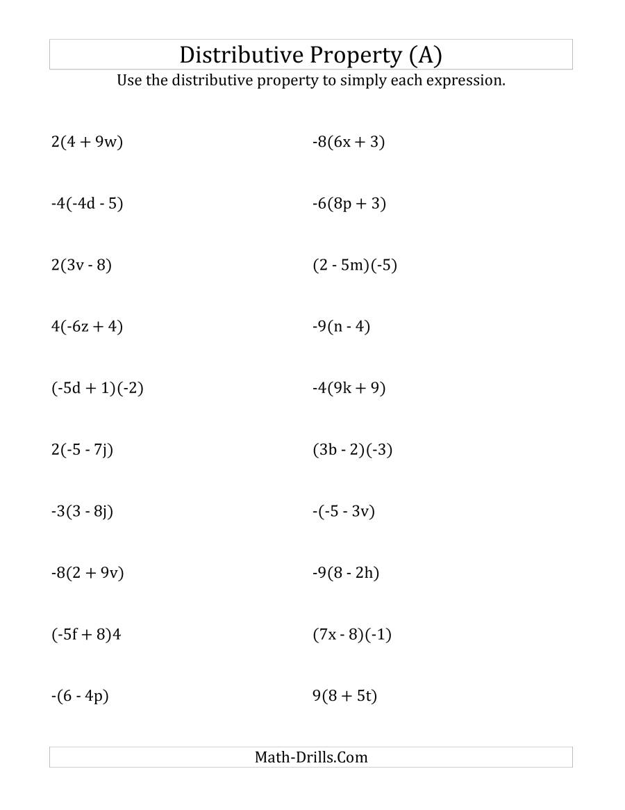 One common type of problem found on distributive property of multiplication worksheets is distributing a number or variable to a set of numbers or variables inside parentheses. For example, a problem might ask students to distribute the number 3 to the expression (2 + 4). By applying the distributive property, students would multiply 3 by each term inside the parentheses to simplify the expression.