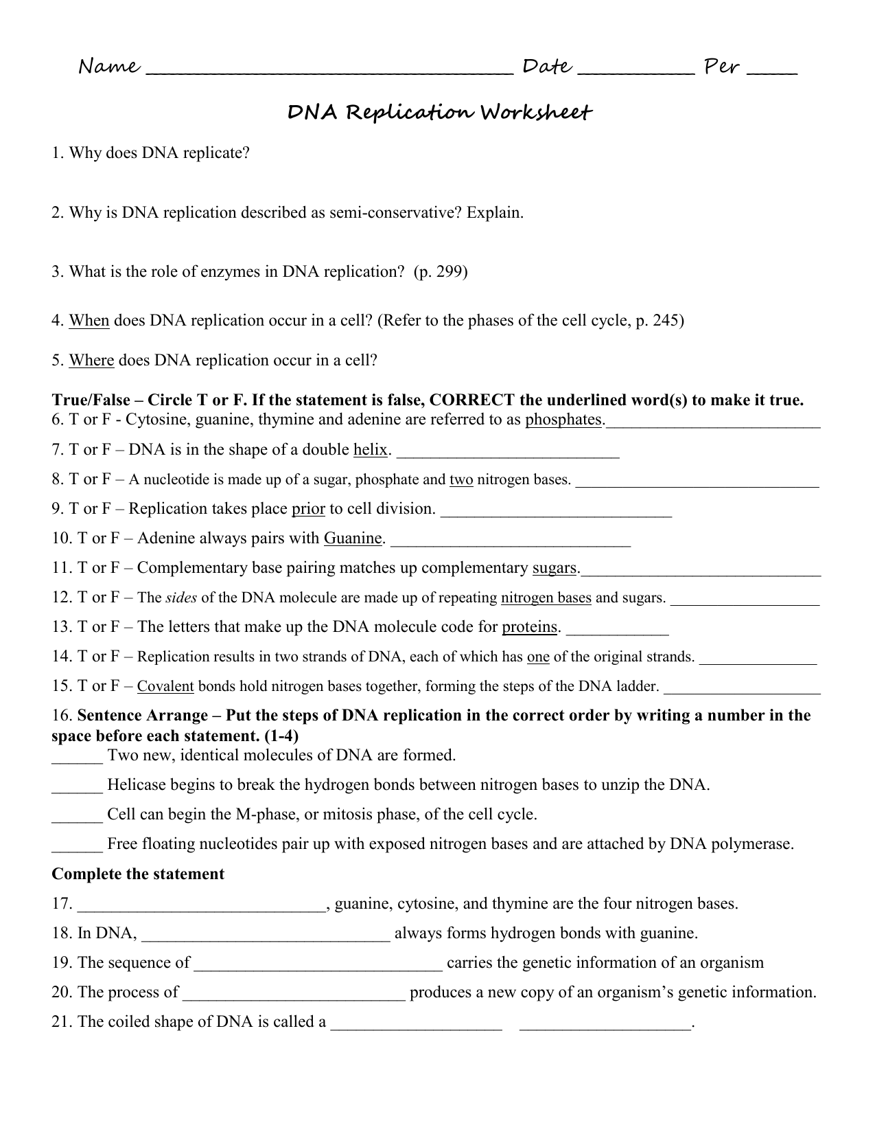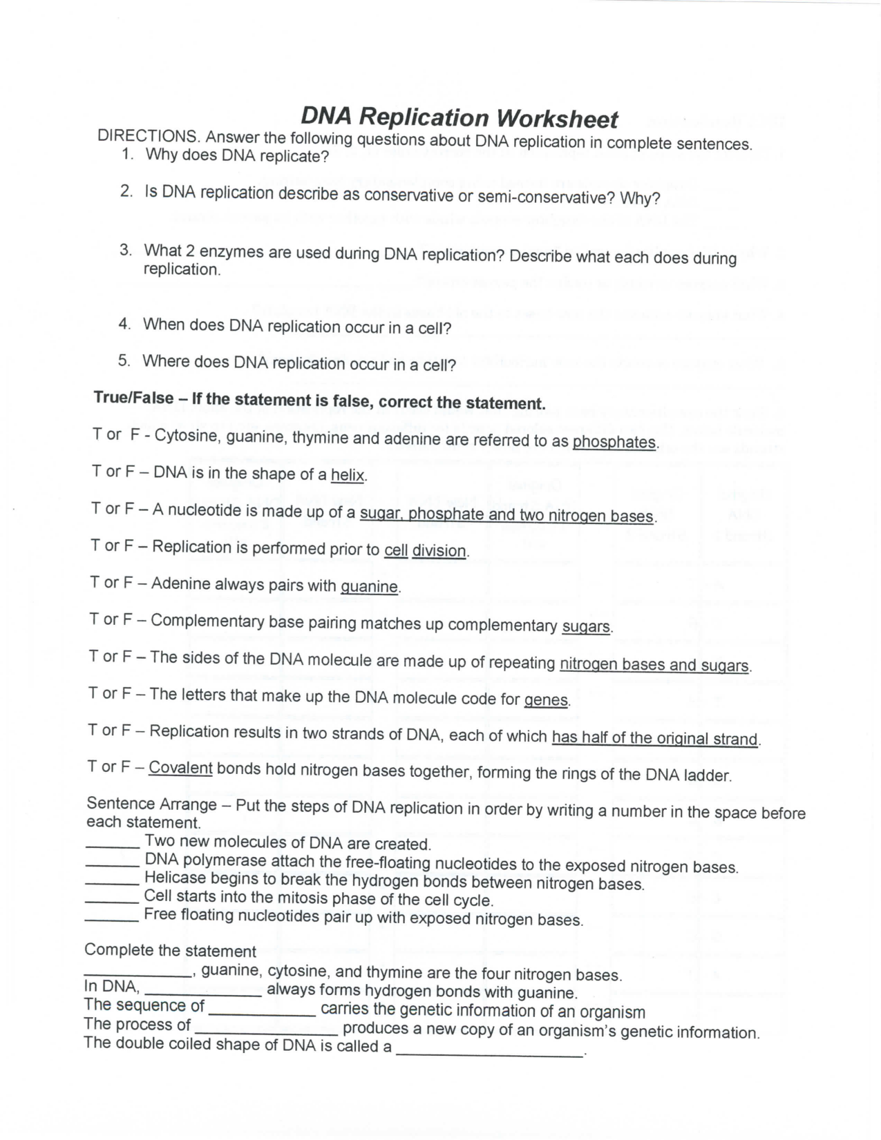 DNA and Replication Worksheet Answer Key