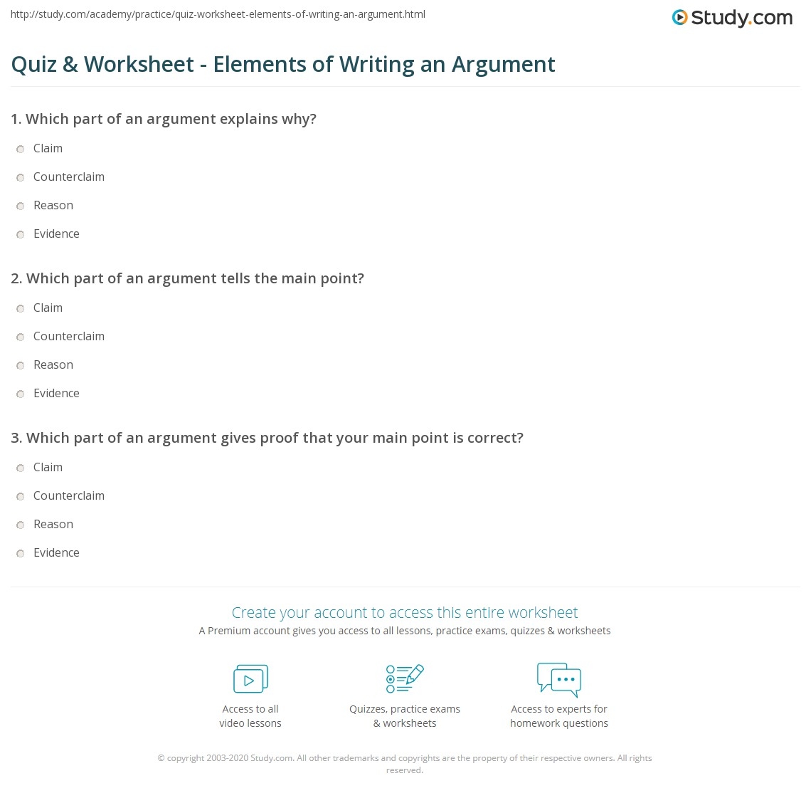 1. Claim: The first element of an argument practice worksheet is the claim. This is the main point that the individual is trying to make or prove. It should be clear, specific, and debatable to engage the audience and spark discussion.