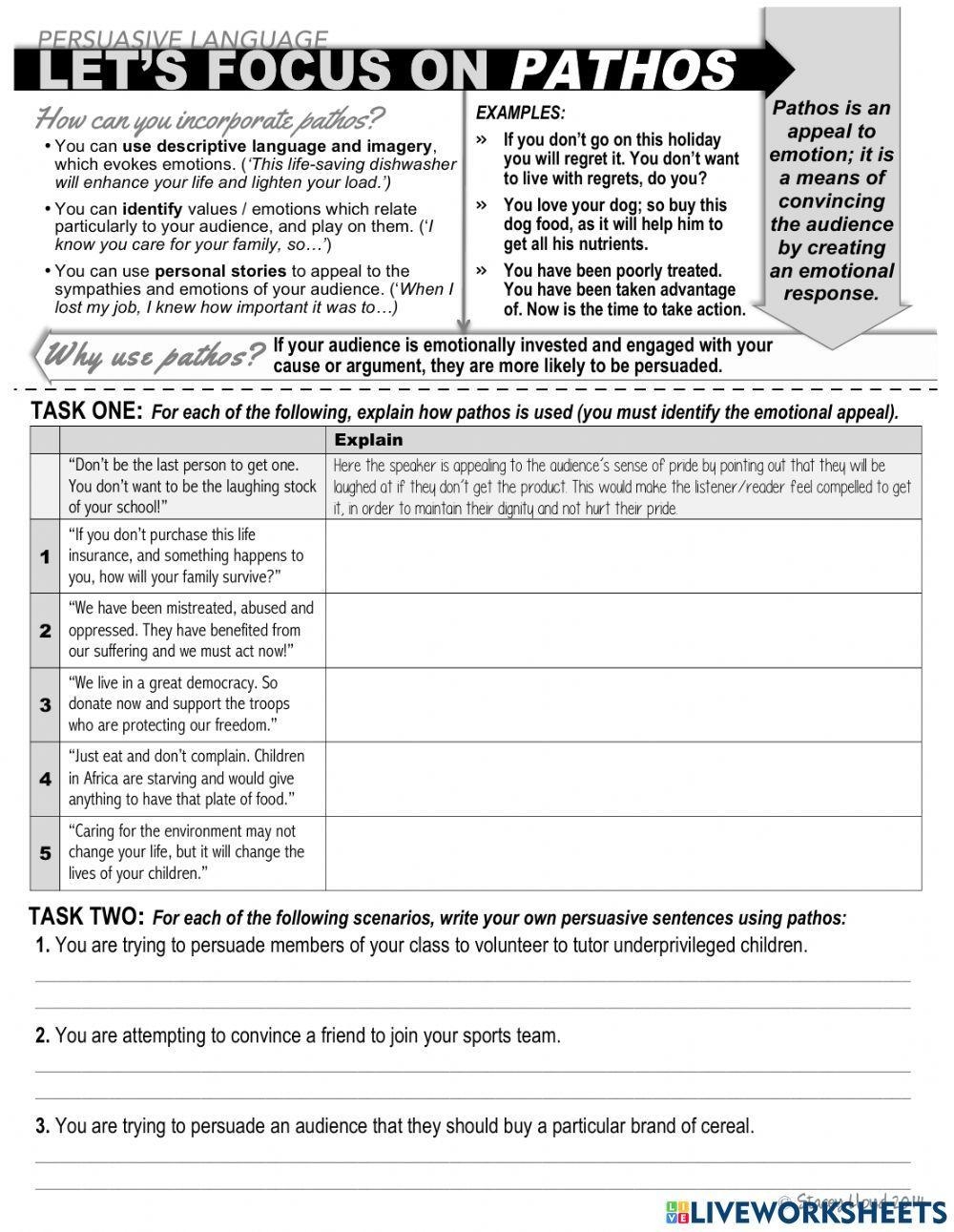 2. Pathos: Pathos appeals to the emotions of the audience. In this section of the worksheet, think about how you can evoke specific emotions in your audience to make them more receptive to your message. This could involve using storytelling, vivid language, or appealing to the audience’s values and beliefs.
