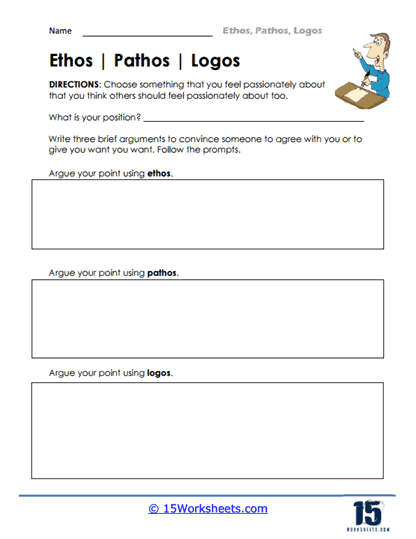 1. Ethos: This refers to the credibility or trustworthiness of the speaker or writer. In your worksheet, identify ways in which you can establish your credibility with your audience. This could include citing reliable sources, sharing personal experiences, or highlighting your expertise on the topic.