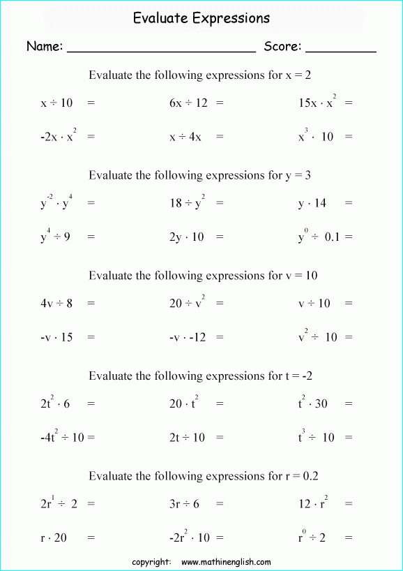 Algebraic expressions are a fundamental part of mathematics, and being able to evaluate them correctly is essential for solving mathematical problems. To help students practice this skill, teachers often provide worksheets specifically designed for evaluating algebraic expressions. These worksheets typically contain a variety of expressions for students to work through, allowing them to practice and improve their algebraic evaluation skills.