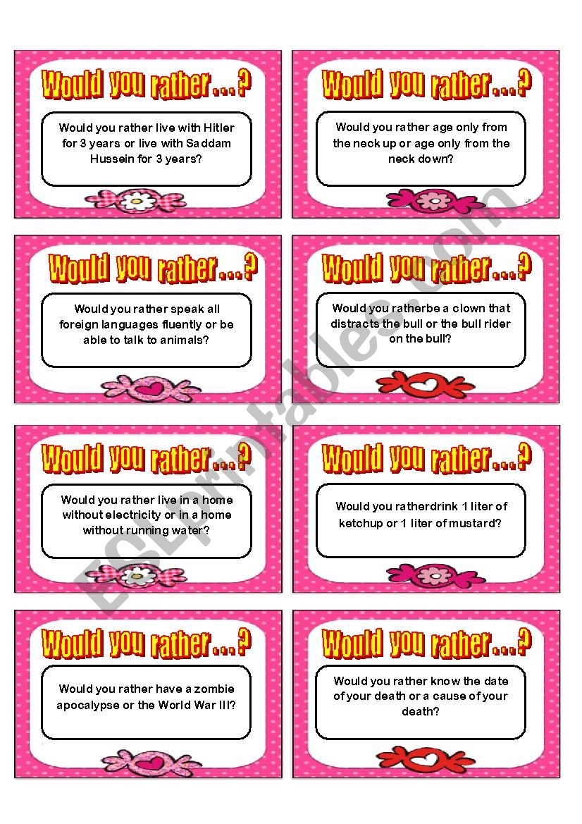 In conclusion, free printable would you rather cards are a fantastic resource for fun and meaningful conversations. They are easy to access, simple to use, and suitable for all ages. So why not give them a try and add a new dimension to your social interactions? Download some cards today and get ready to enjoy hours of laughter and thought-provoking discussions.