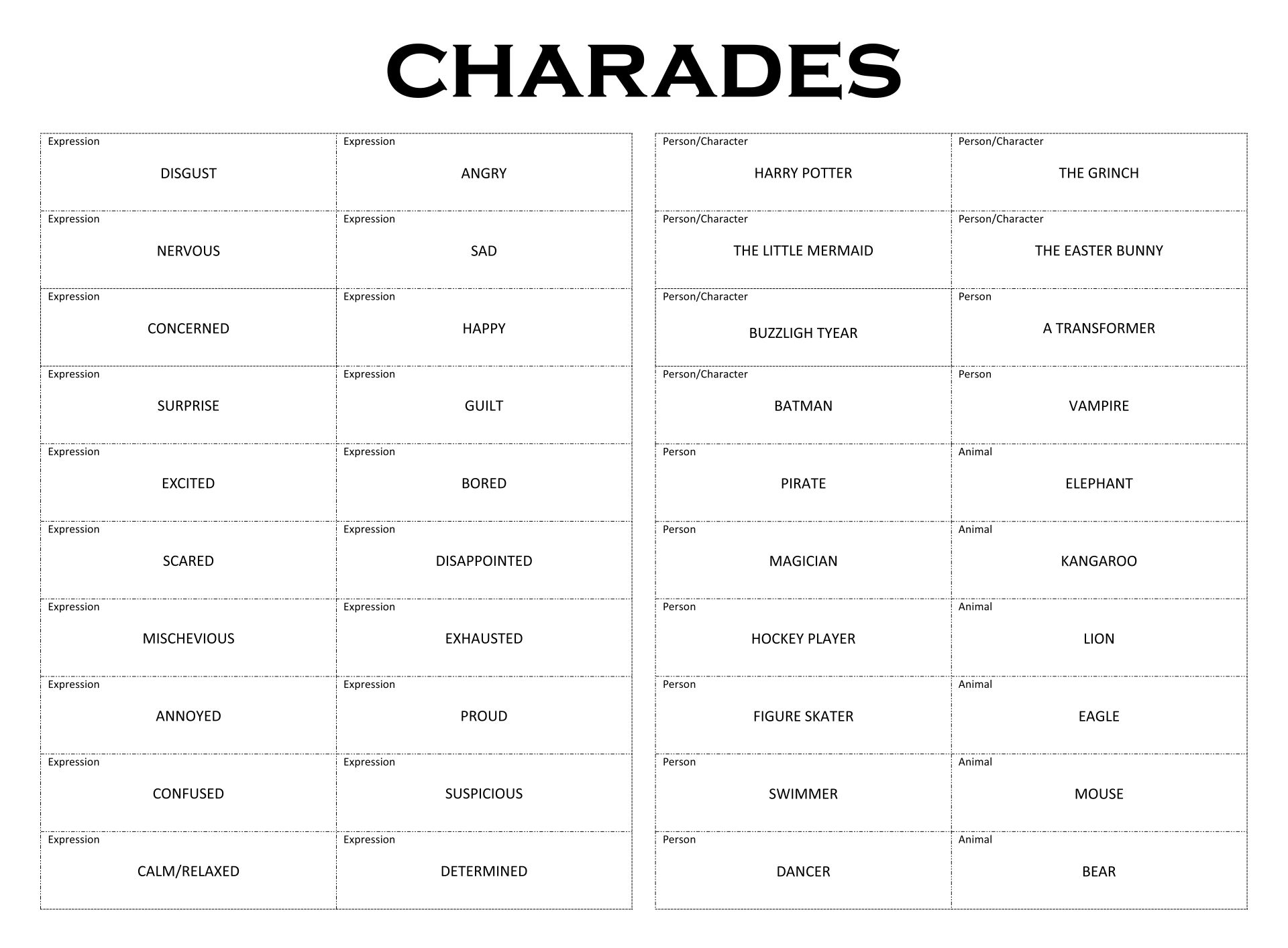 So, whether you’re planning a game night, a family reunion, or just looking for a fun activity to pass the time, consider downloading some funny charades printable cards in PDF format. It’s a simple and entertaining way to add some laughter and joy to any gathering!