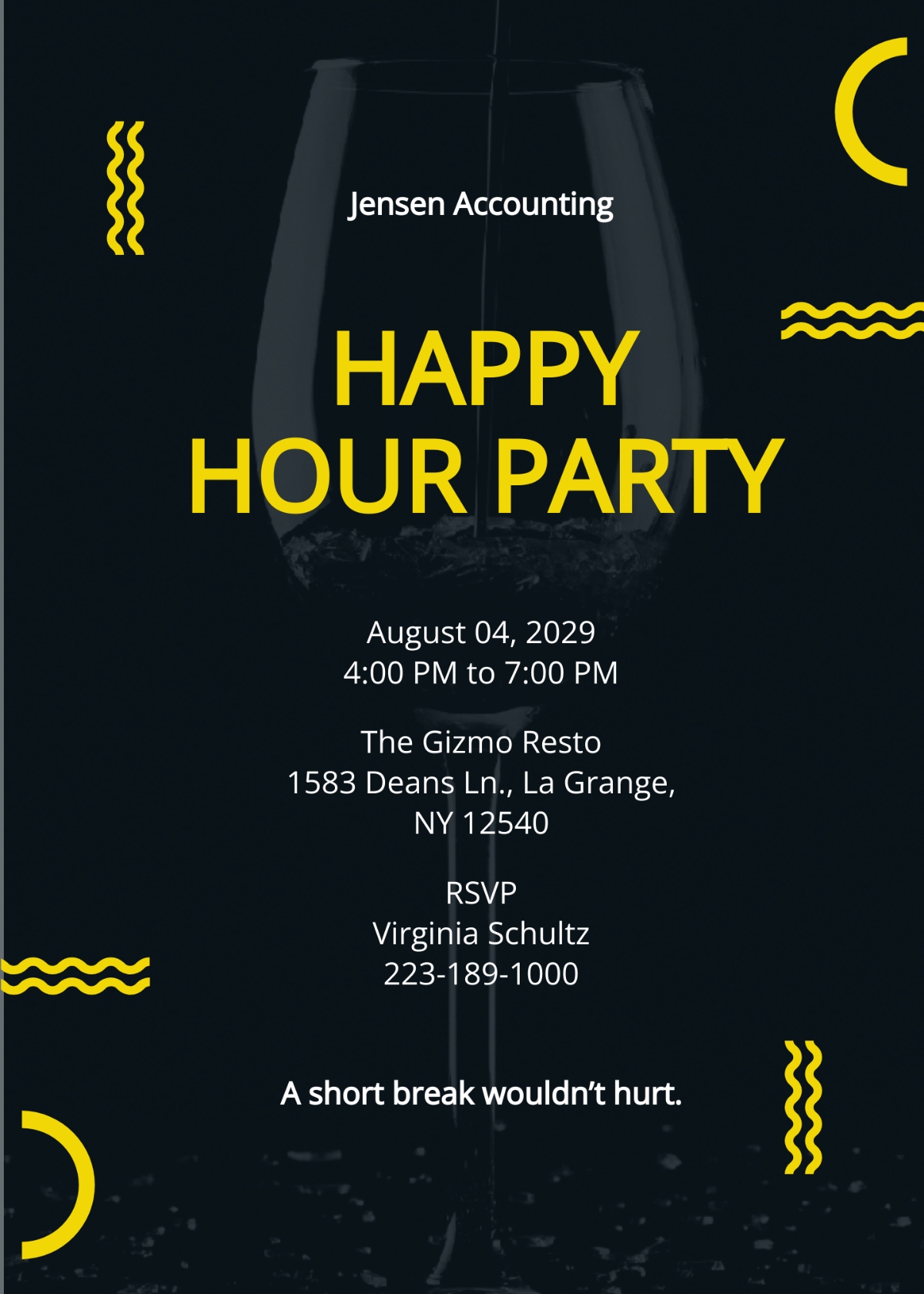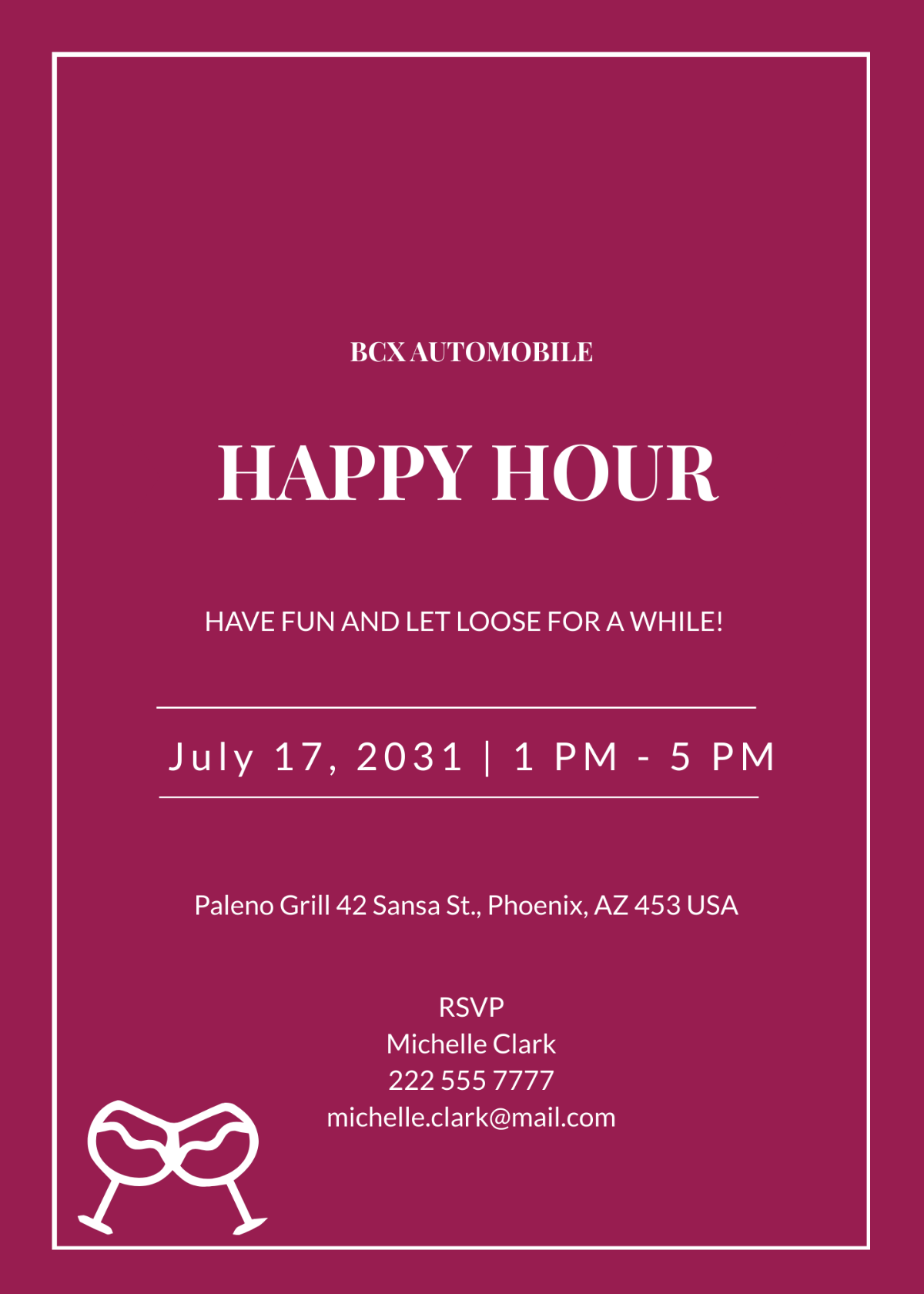 Don’t forget to include enticing details about the drinks and snacks that will be served during happy hour to entice your guests to join in on the fun. You can even include special offers or discounts to make your event even more appealing. With the right invitation, you can set the tone for a memorable and enjoyable happy hour experience.