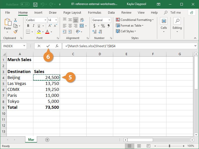 5. Press Enter to complete the formula and link the data from the source worksheet to the destination worksheet.