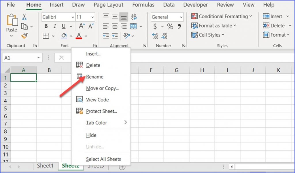 2. Select the “Rename” option from the context menu. The current name of the worksheet will become editable, allowing you to type in a new name for the worksheet.