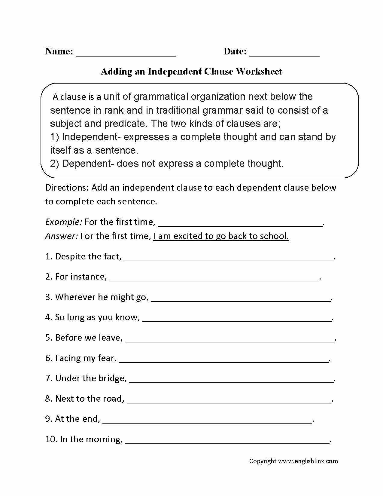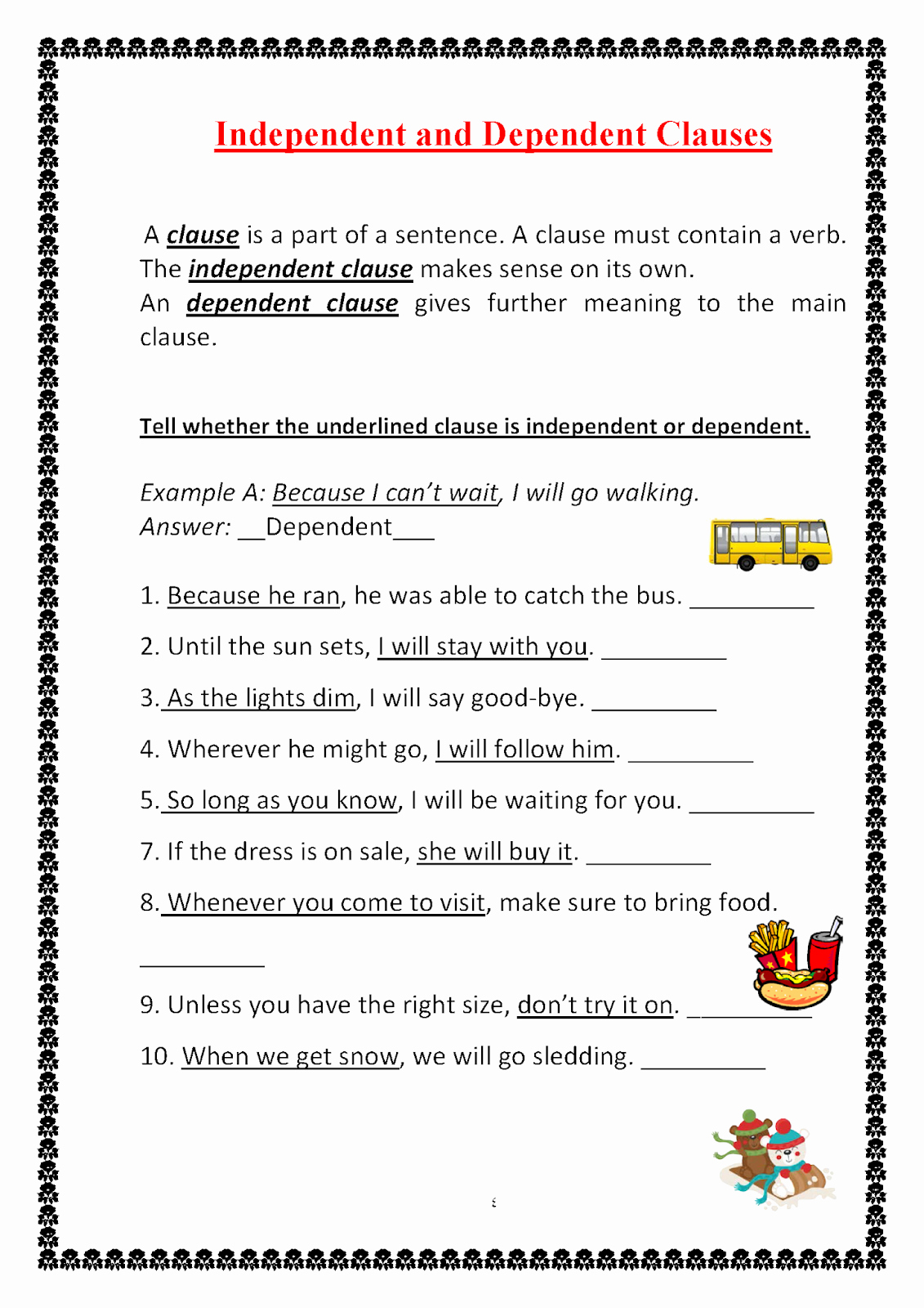 Independent and Dependent Clauses Worksheet