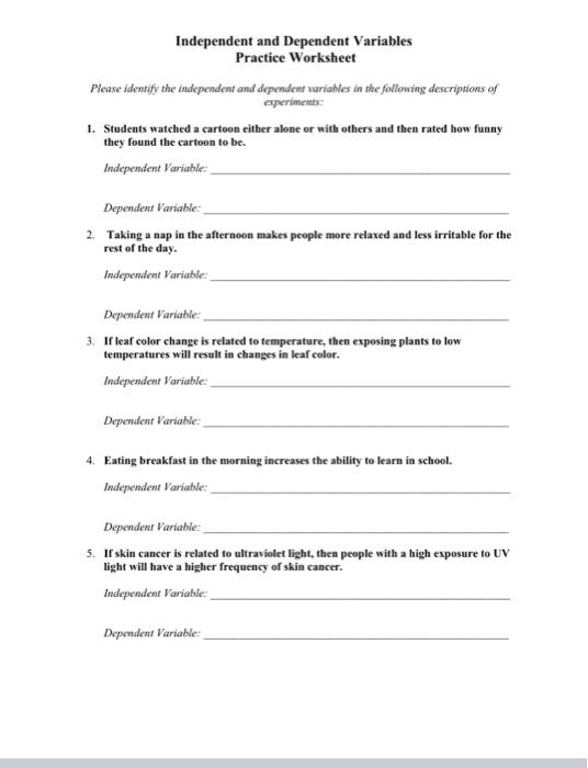 An independent dependent variable worksheet is a useful tool for students to practice identifying and understanding these variables in various scenarios. The worksheet typically consists of different experimental setups or scenarios where students are required to identify the independent and dependent variables. By working through these exercises, students can enhance their understanding of how variables are interconnected in an experiment and improve their critical thinking skills.