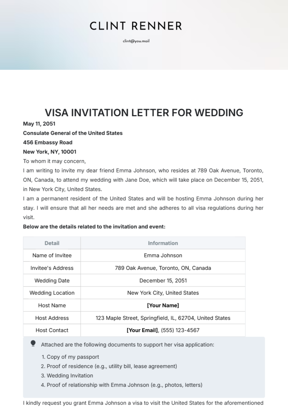 In conclusion, a well-written invitation letter can greatly enhance your Canadian visa application. By following the template outlined above and including all necessary information, you can demonstrate to immigration officials that you have a legitimate reason for visiting Canada and that you have a reliable host during your stay. Good luck with your visa application!