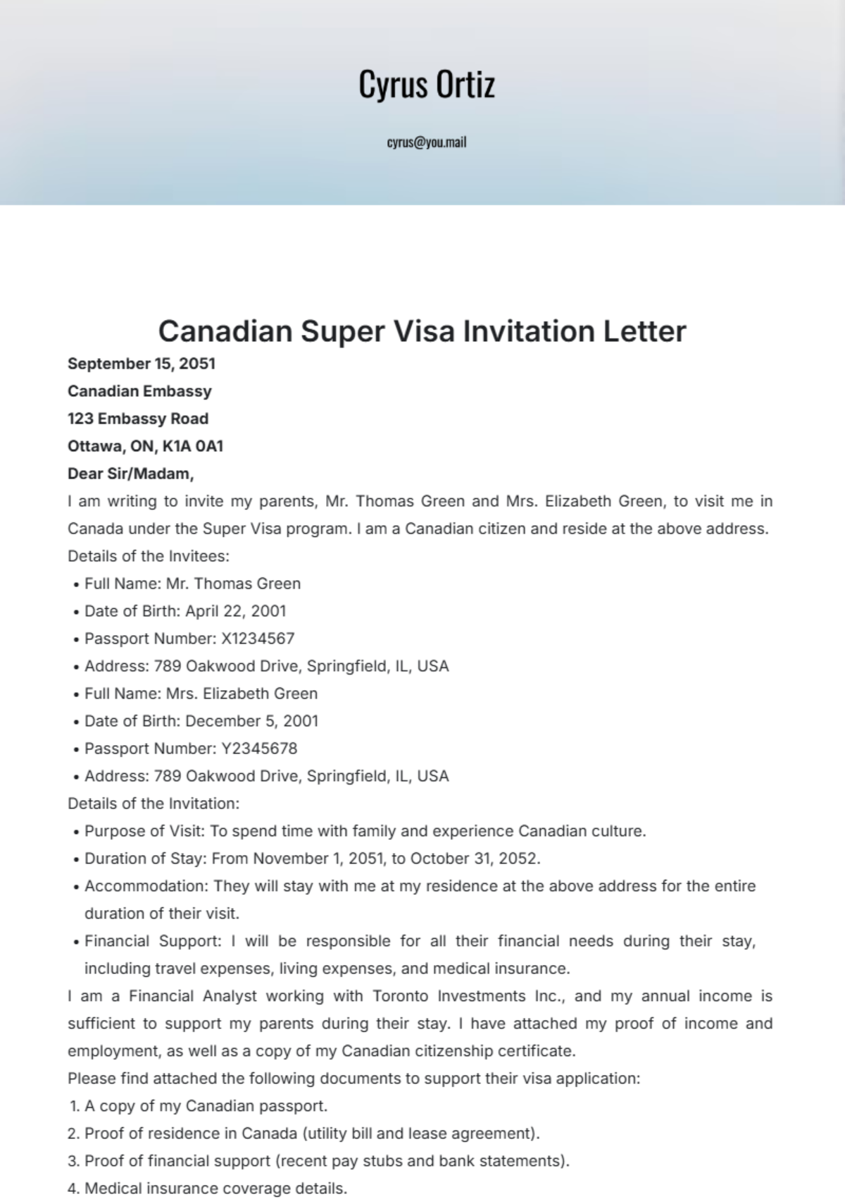 Free Canadian Super Visa Invitation Letter Template To Edit Online