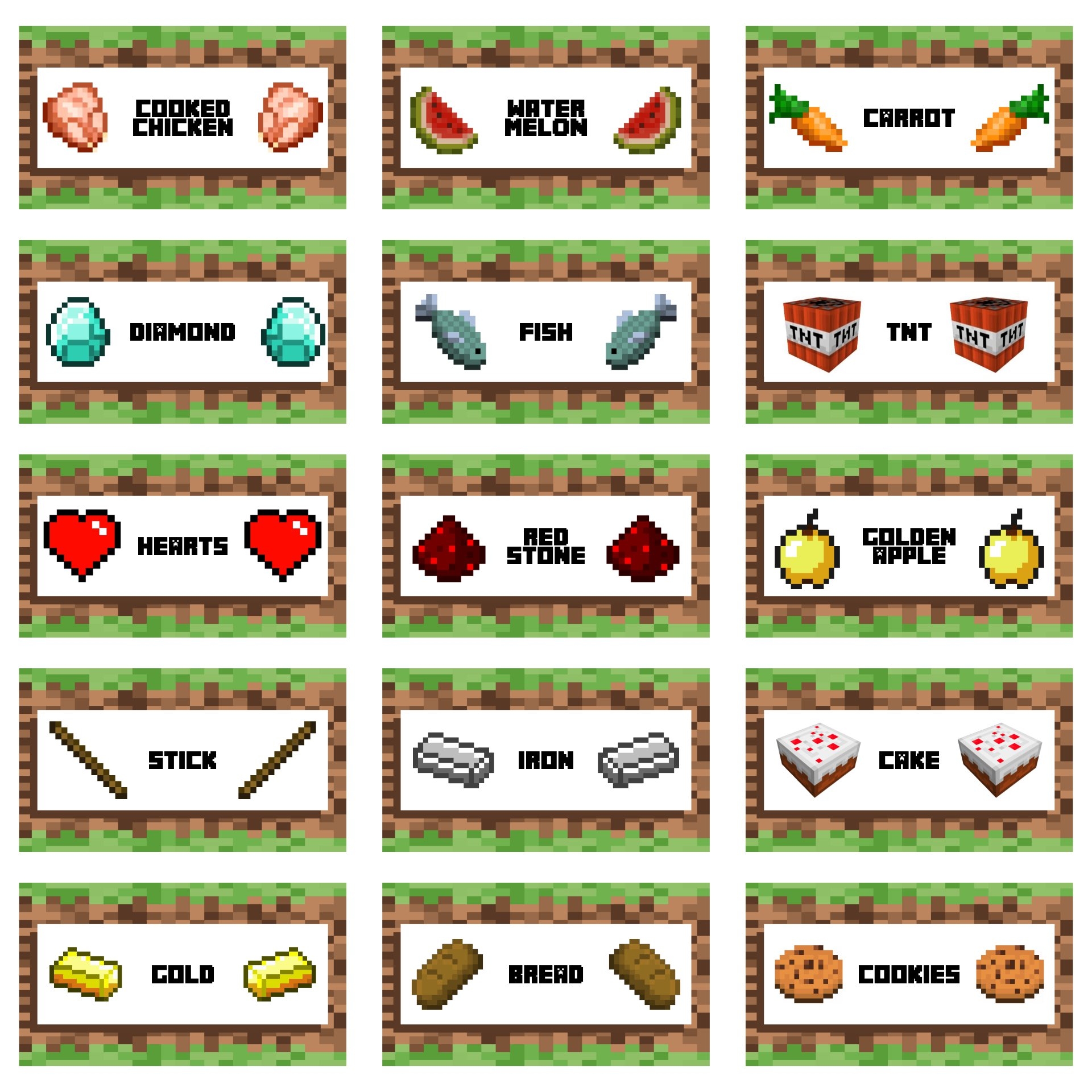 Whether you’re serving “Creeper Crunch” or “Diamond Nuggets,” these food tent cards will add a touch of Minecraft magic to your party table. Simply print, cut, and fold the cards to create adorable labels for all of your party treats.