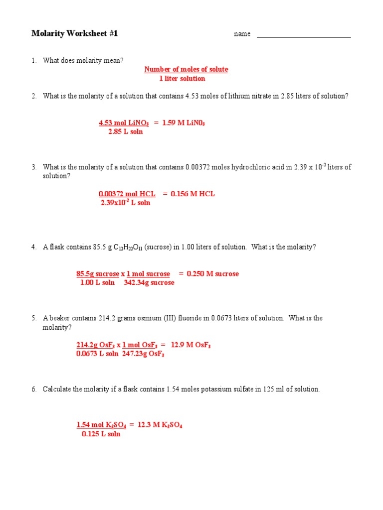 A molarity worksheet typically consists of a series of problems that require students to calculate the molarity of a solution or determine the volume or mass of a solute needed to prepare a solution of a specific concentration. Working on these problems helps students to reinforce their understanding of molarity and improve their ability to perform calculations accurately.