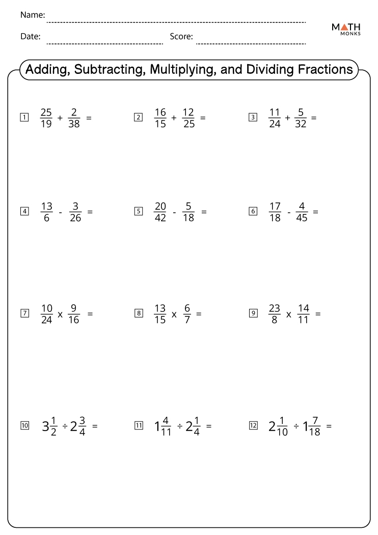 Worksheets on multiplication and division of fractions can include a variety of problems ranging from simple to complex. Students can practice multiplying and dividing fractions with whole numbers, mixed numbers, and even word problems. This variety helps students develop a deep understanding of how to apply these operations in different situations.