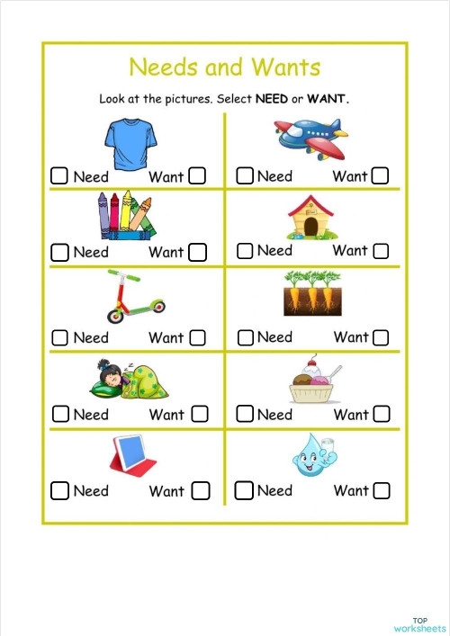 A needs and wants worksheet is a helpful tool that can assist individuals in identifying and categorizing their needs and wants. By listing out items and determining whether they are essential for survival or simply desired for pleasure, individuals can gain a better understanding of their priorities and make more informed choices.