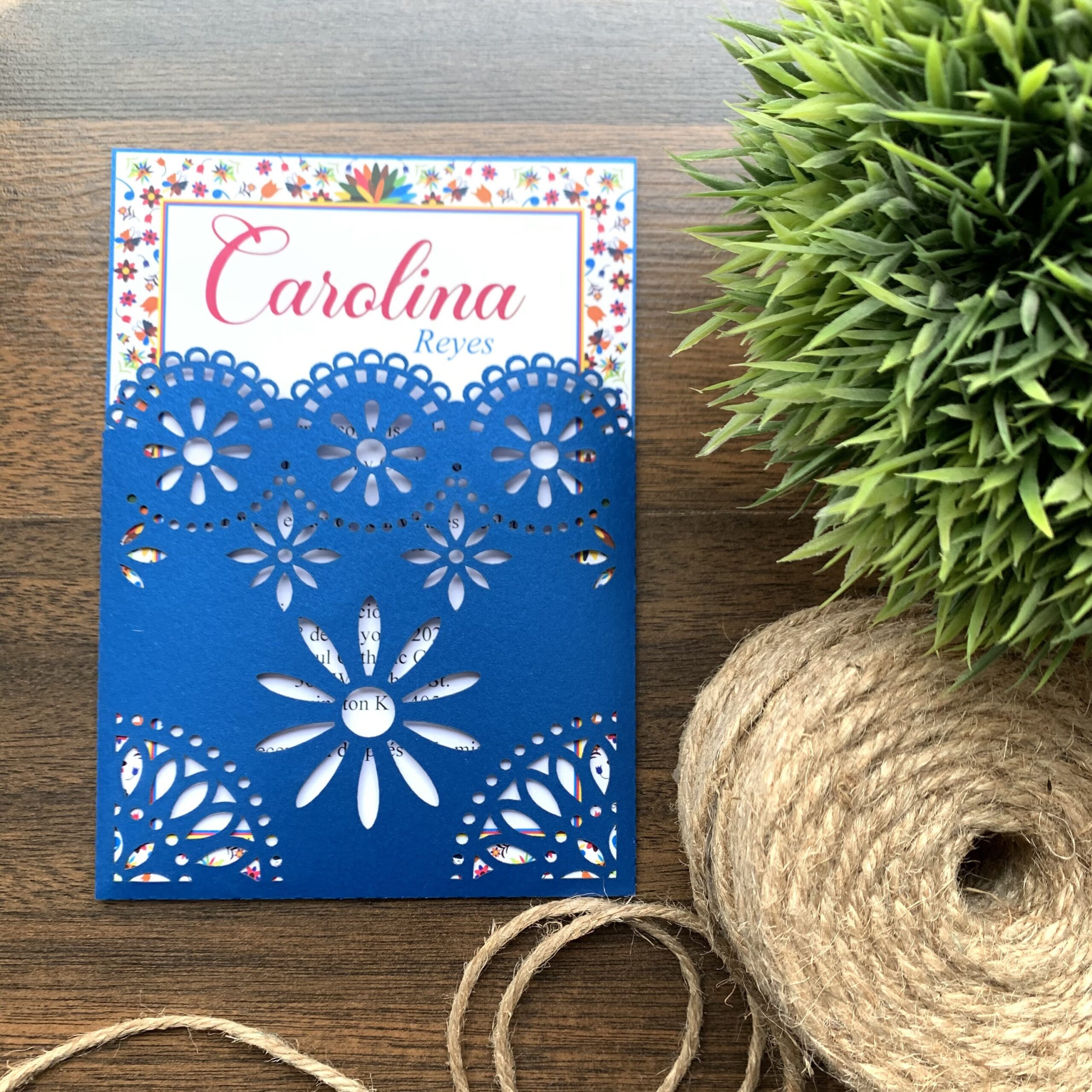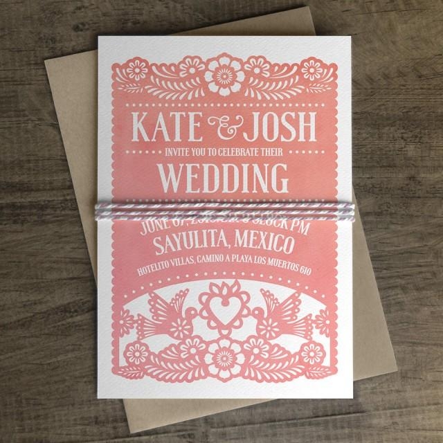 Papel picado is a traditional Mexican folk art form that involves cutting intricate designs into colorful tissue paper. These delicate and intricate designs can add a touch of elegance and charm to your wedding invitations.