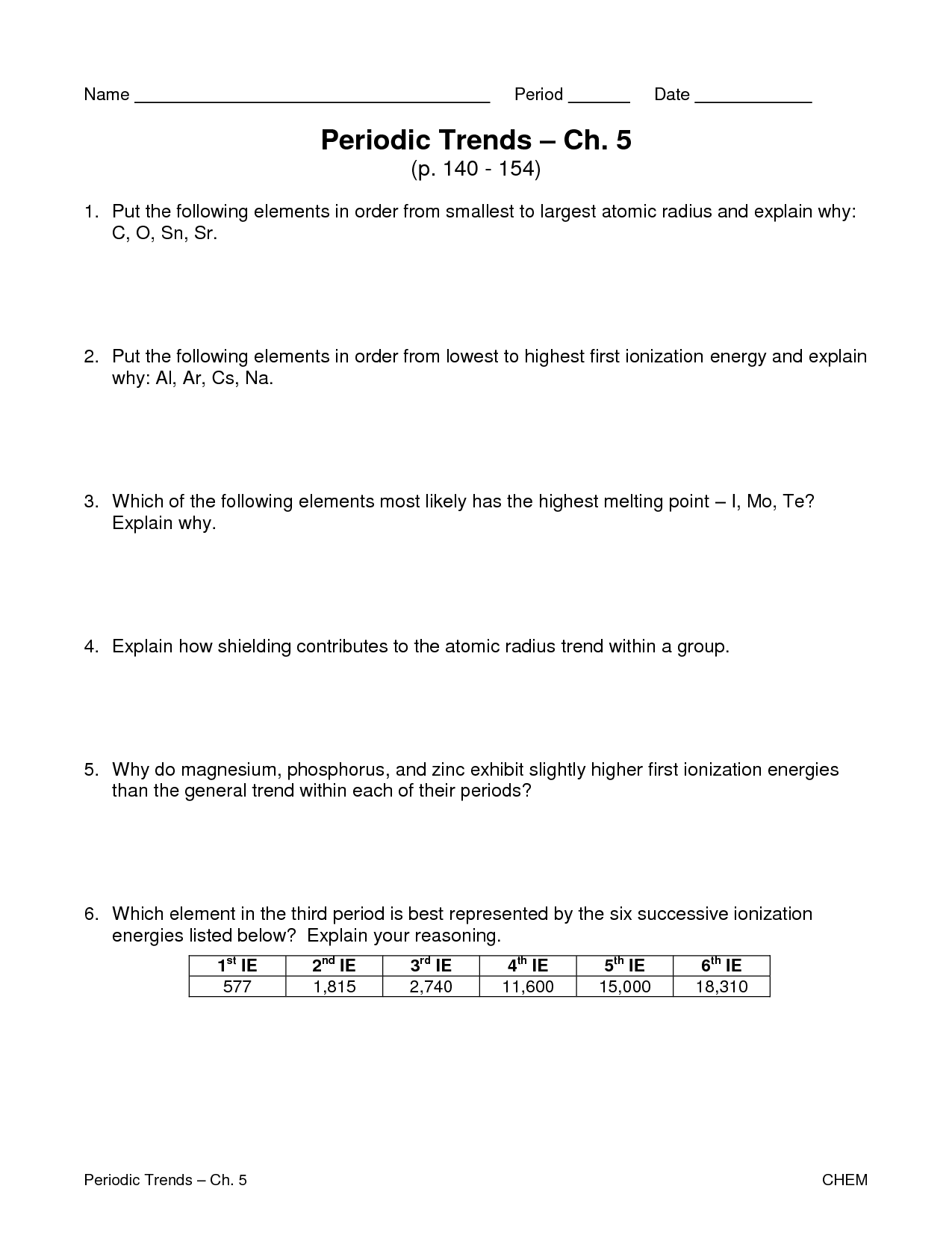 Another type of question on a periodic trends worksheet could involve comparing the ionization energies of different elements. Students would need to recognize that ionization energy generally increases from left to right and from bottom to top in the periodic table. By practicing these types of problems, students can improve their ability to analyze and interpret data related to periodic trends.