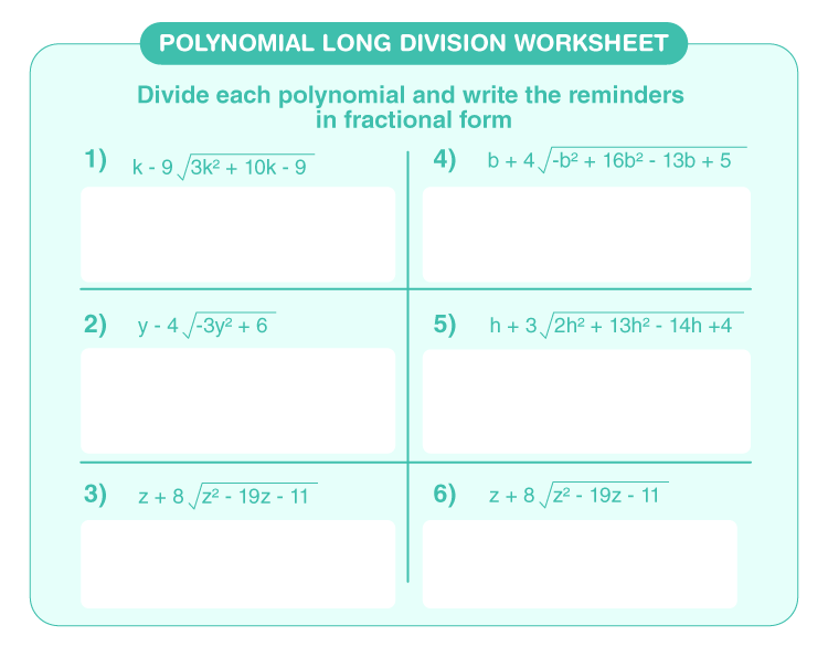 Polynomial division worksheets typically include a series of polynomial division problems that require students to divide one polynomial by another. These worksheets can vary in difficulty, from simple problems with monomials to more challenging problems with higher degree polynomials. By working through these worksheets, students can build their confidence and proficiency in polynomial division.