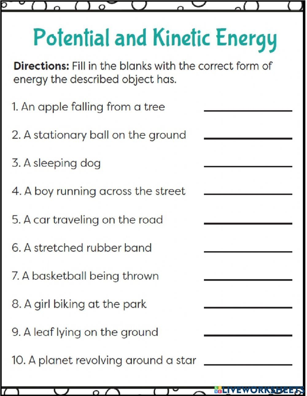 One way to engage students in learning about potential and kinetic energy is through the use of worksheets. These worksheets typically include various scenarios or problems that require students to identify and calculate potential and kinetic energy. By working through these exercises, students can develop a deeper understanding of how energy is transferred and transformed in different situations.