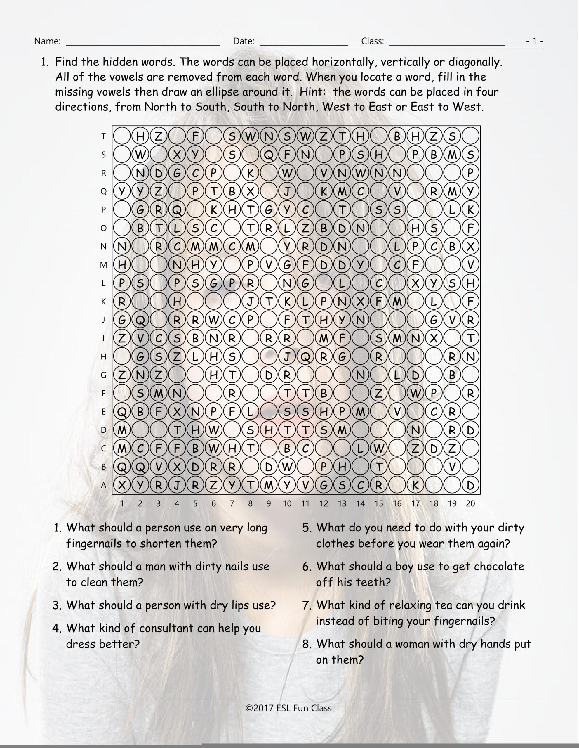 Below is a downloadable missing vowels worksheet that you can print out and use with your students. Simply click on the image to open the PDF file and then print as many copies as you need. Encourage your students to work independently or in pairs to complete the worksheet.