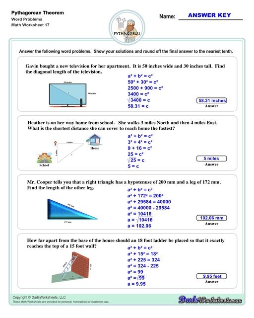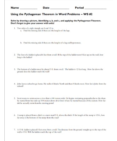 A Pythagorean Theorem word problems worksheet is a great way for students to practice applying this theorem to solve practical problems. These worksheets typically present students with a series of word problems that involve finding the lengths of the sides of a right triangle using the Pythagorean Theorem. By working through these problems, students can develop a better understanding of how to apply the theorem in different situations.