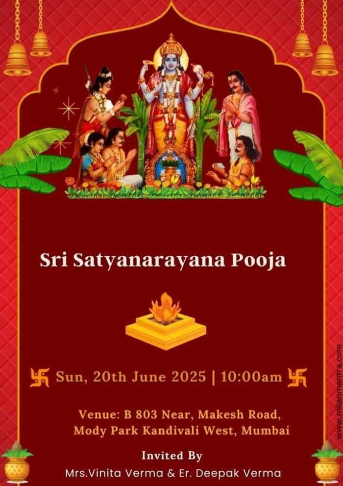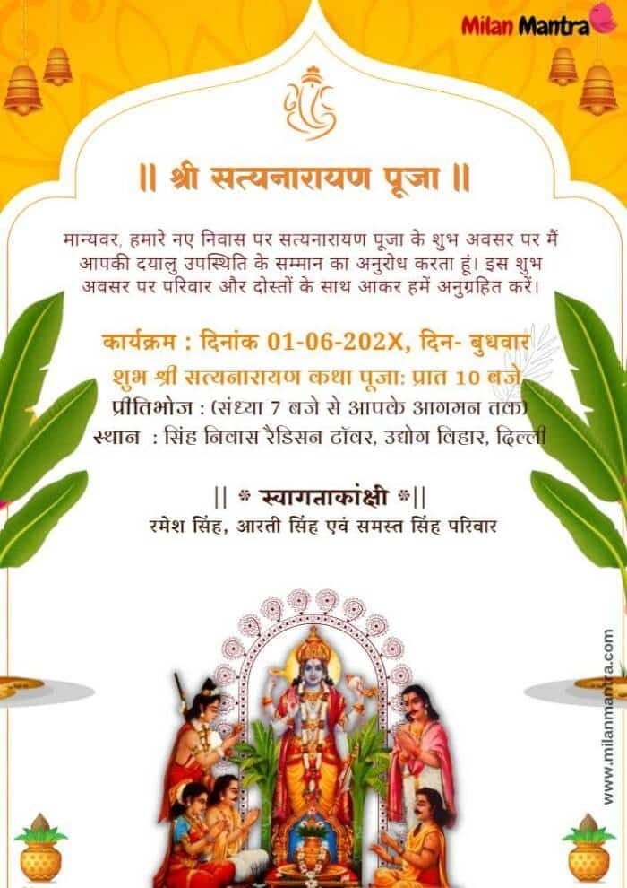 Hosting a Satyanarayan Pooja is a special time for families to come together and celebrate their faith. Whether it’s a small gathering at home or a large community event, our invitation template can help you set the tone for a memorable and meaningful ceremony. By sending out personalized invitations, you can create anticipation and excitement among your guests.