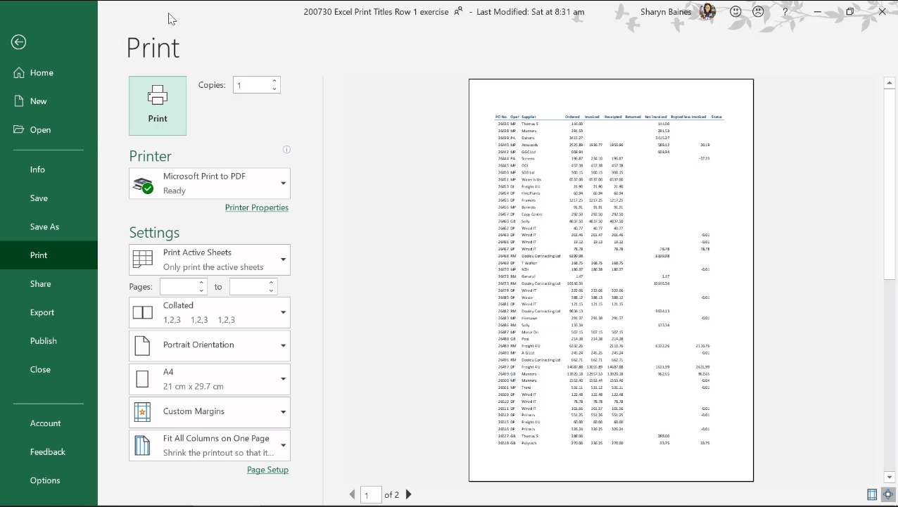 Once row 3 is set as the print titles, you can test it out by previewing your worksheet in print layout view. You should see that row 3 is repeated at the top of each page, making it easier to reference the information contained in that row as you flip through the printed pages.