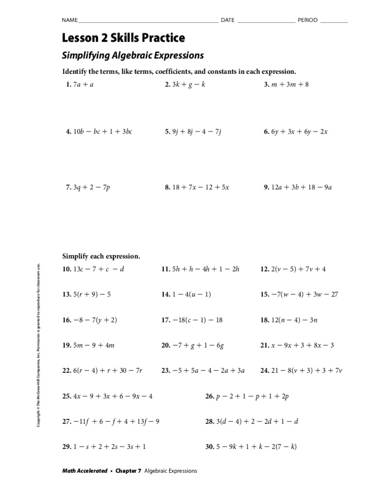 When completing a simplifying algebraic expressions worksheet, it is important for students to remember the rules of algebra. This includes understanding how to combine like terms, distribute terms when necessary, and simplify expressions by following the correct order of operations. By practicing these skills repeatedly on a worksheet, students can reinforce their understanding and improve their ability to simplify algebraic expressions accurately and efficiently.