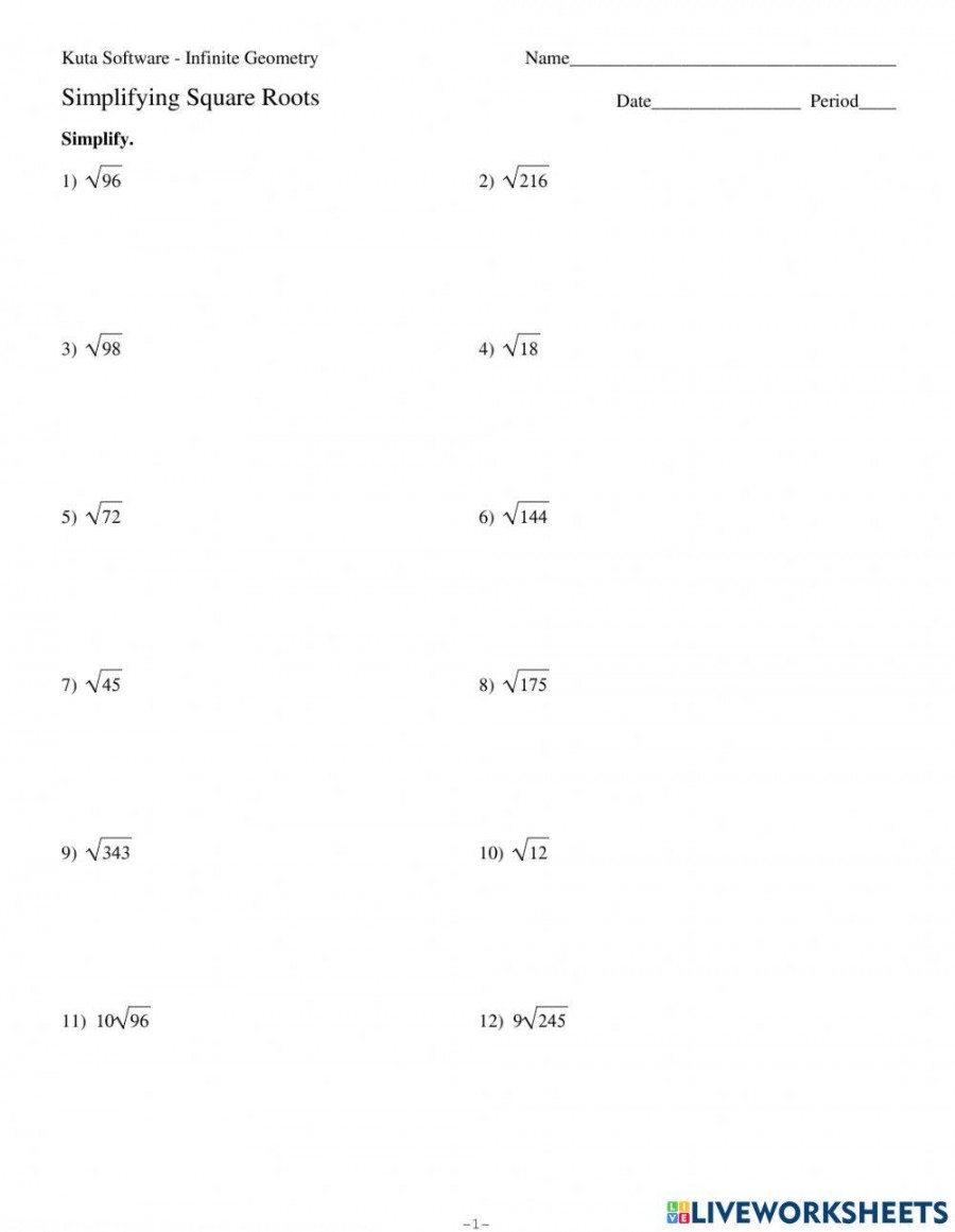 When it comes to mathematics, simplifying square roots can be a daunting task for many students. However, with the right guidance and practice, it can become a much simpler process. One effective way to help students understand and master this concept is through the use of worksheets. These worksheets provide a structured approach to practicing simplifying square roots, allowing students to gradually build their skills and confidence in this area.