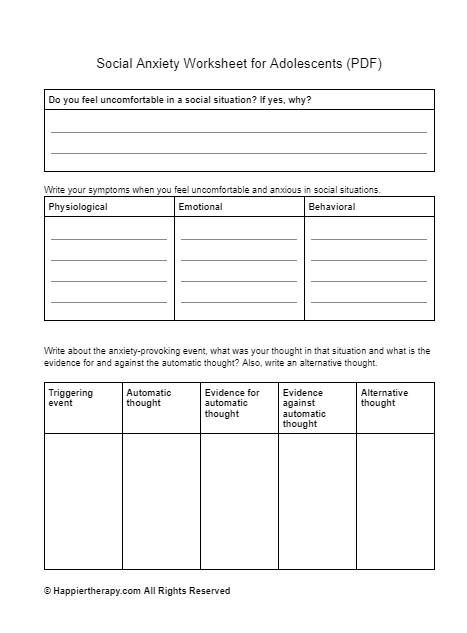 One common type of social anxiety worksheet is the thought record worksheet. This worksheet helps individuals identify and challenge negative thoughts that contribute to their social anxiety. By writing down their thoughts, individuals can learn to recognize patterns and irrational beliefs that may be fueling their anxiety.