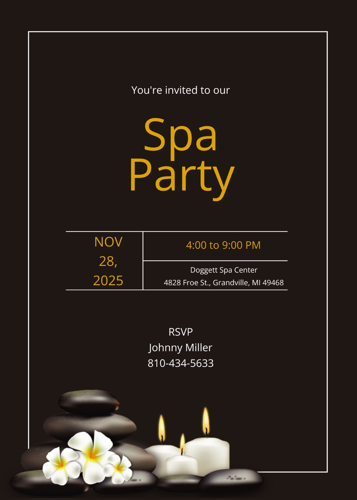 Indulge in the luxury of a spa day with our invitation template. Create a serene and inviting atmosphere for your guests and set the stage for a day of relaxation and rejuvenation. Download our spa invitation template and start planning your unforgettable spa day today!