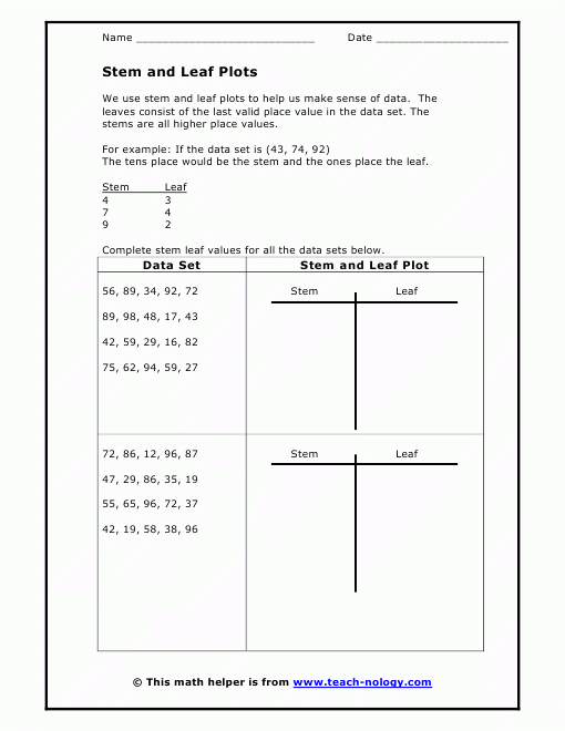 Students can also use stem and leaf plot worksheets to practice different types of data sets, such as whole numbers, decimals, or fractions. This allows them to gain a better understanding of how to create and interpret stem and leaf plots for various types of data.