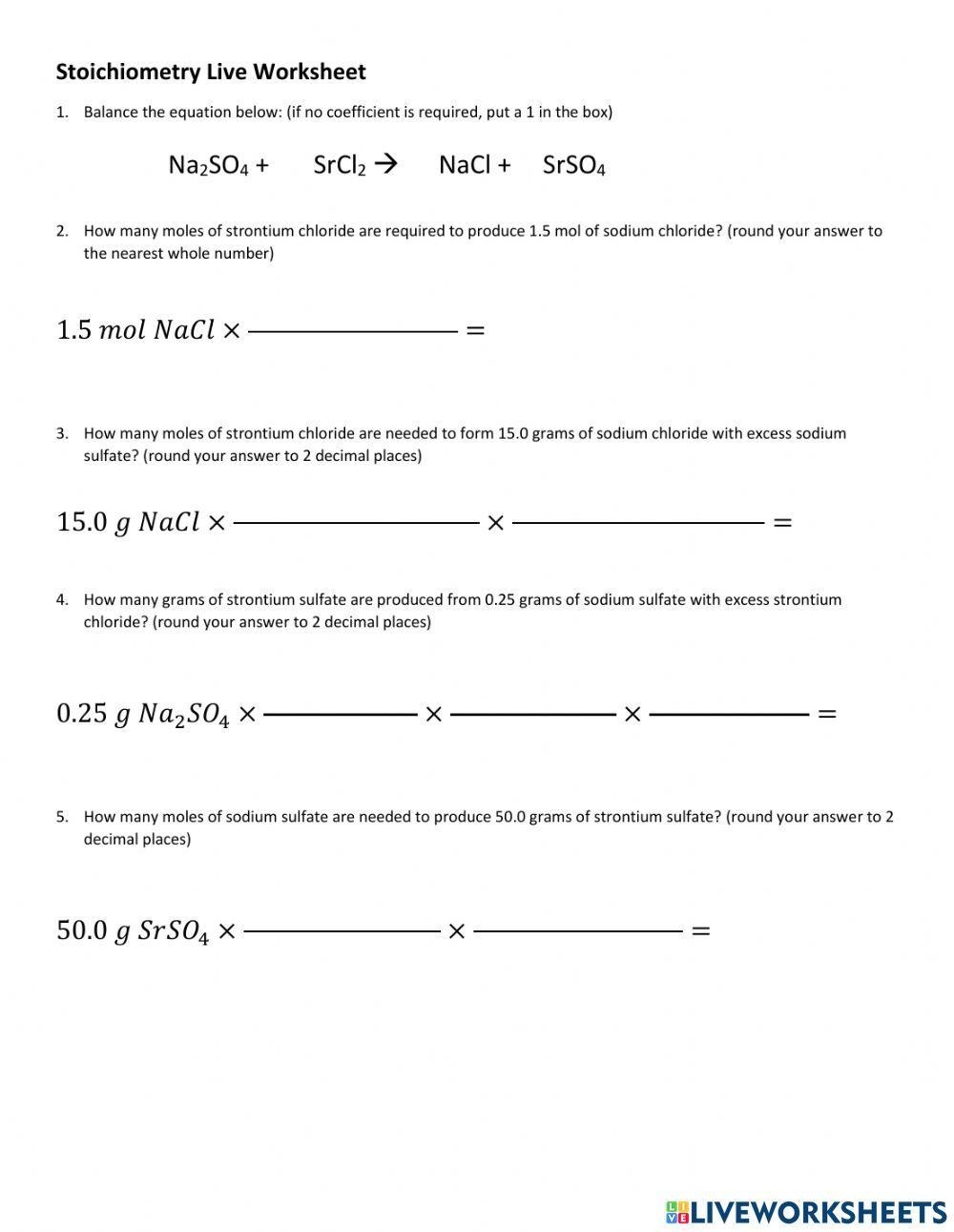 Stoichiometry practice worksheets typically consist of a series of chemical reactions for which students have to balance the equations and then perform various calculations based on the balanced equations. These calculations may involve determining the limiting reactant, calculating the theoretical yield of a product, or finding the percentage yield of a reaction. By working through these problems, students can develop a better understanding of stoichiometry and improve their problem-solving skills.
