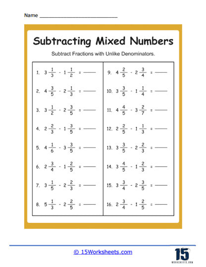 These worksheets typically include a mix of problems that vary in difficulty, allowing students to gradually build their skills and confidence in subtracting mixed numbers. By providing ample practice opportunities, students can improve their ability to perform these calculations accurately and efficiently.