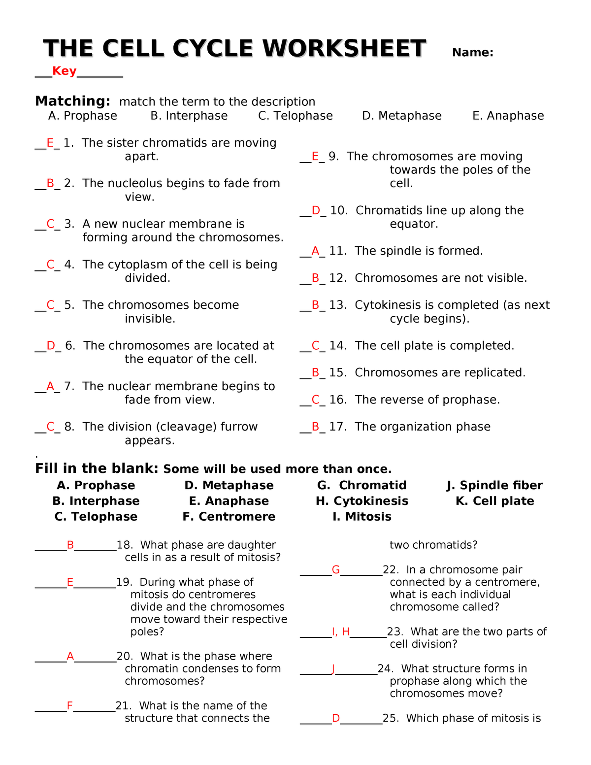 The Cell Cycle Worksheet Answer Key