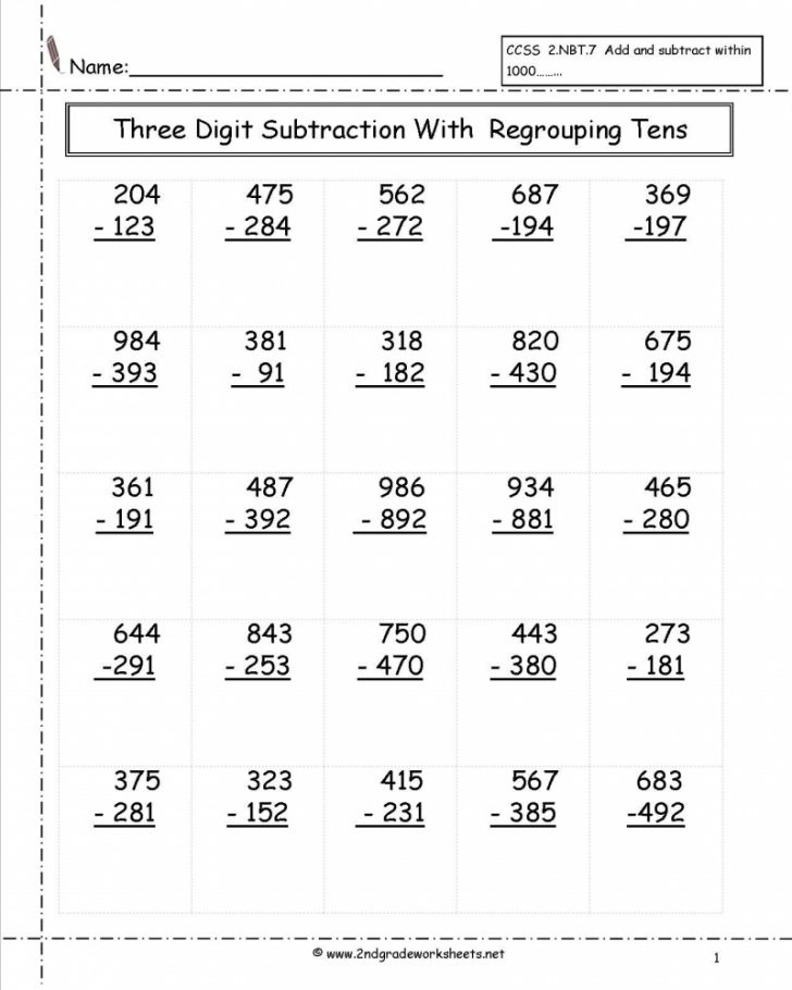 Subtraction is an essential mathematical skill that students need to master. One of the more challenging aspects of subtraction is when regrouping is required, especially when dealing with three-digit numbers. To help students practice this skill, teachers often provide worksheets specifically focused on three-digit subtraction with regrouping.