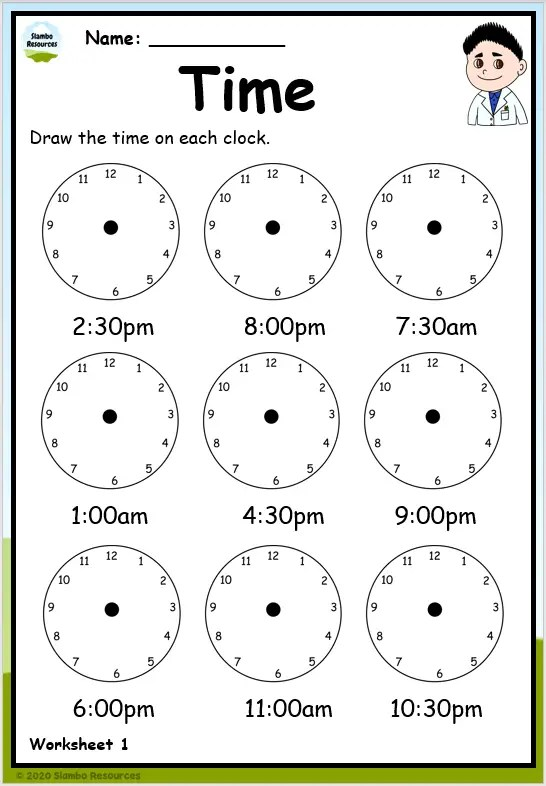Time worksheets for grade 3 typically include exercises such as reading analog clocks to the nearest minute, converting digital time to analog time, identifying the time shown on clocks, and solving word problems involving time. These worksheets are designed to cater to different learning styles and abilities, ensuring that all students can benefit from practicing time-telling skills.